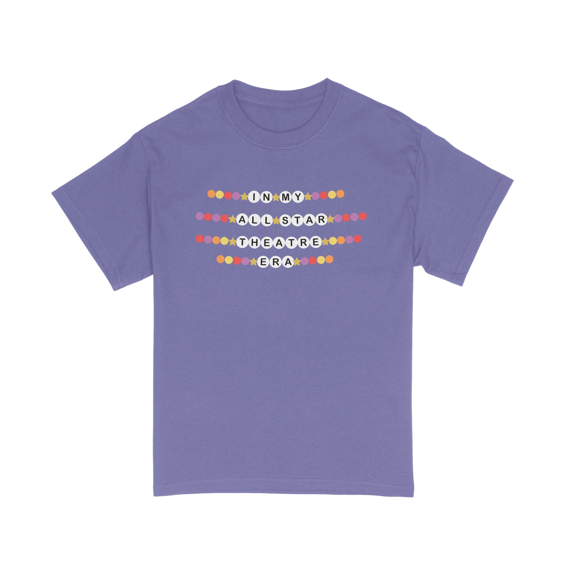 Introducing "In My All Star Theatre Era" t-shirt, inspired by Taylor Swift's iconic friendship bracelet. This shirt is a must-have for any Swiftie, featuring a bold and colorful design that pays tribute to the All Star Theatre Era. Crafted from soft and comfortable materials, this shirt is perfect for everyday wear or to show off your love for Taylor Swift. Available in a range of sizes, this t-shirt is a timeless addition to any fan's collection